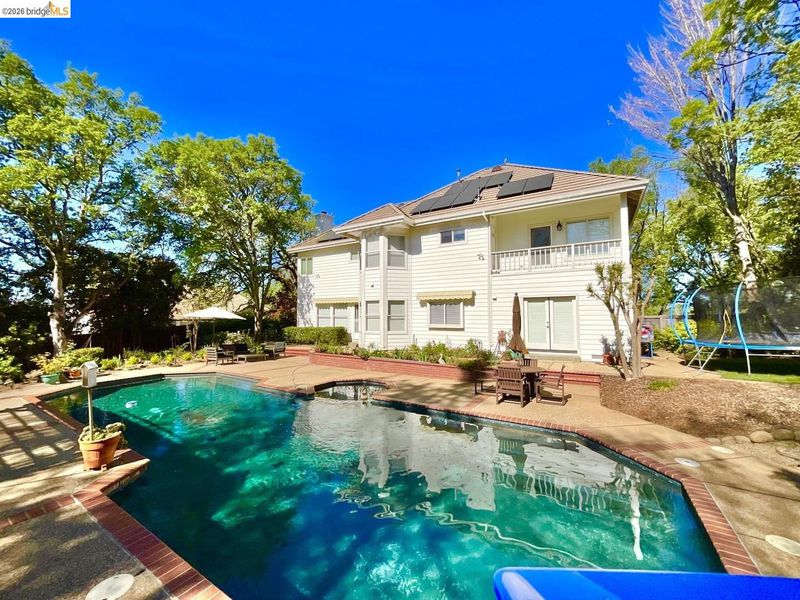 Fully remodeled home in the sought-after Sterlingshire neighborhood of El Dorado Hills offering 4,221 sq ft, 5 bedrooms, 4.5 bathrooms, plus an upstairs movie-room den. The open-concept gourmet kitchen features new quartzite countertops, waterfall island, and rolling chef's island overlooking the dining and formal living areas. The newly remodeled primary suite includes a soaking tub and double shower. Additional upgrades include quartzite in the movie room wet bar and oversized laundry room. Besides the formal living room that flows seamlessly into the kitchen, you also have a separate informal living room with a rare wood fired forced air fireplace. Enjoy resort style living on this .56-acre lot with a pool, spa, gazebo, and three outdoor dining areas, all visible from the kitchen. Energy-efficient features include new solar with 10kWh home battery and a forced-air wood stove capable of heating the entire home, plus split-level central AC/gas. Minutes to private trails and parks.