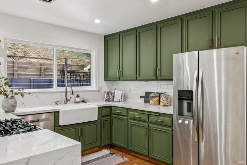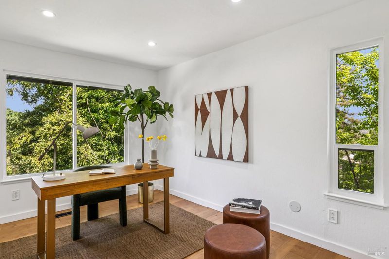 Tucked among the trees with a seamless blend of modern design and natural surroundings, this beautifully updated home offers a rare sense of privacy, comfort, and indoor-outdoor living. This 3-bedroom, 2.5-bathroom home offers approximately 2,250 square feet of thoughtfully designed living space. The main living room features soaring wood-beamed cathedral ceilings, a dramatic fireplace, and walls of windows framing serene, tree-filled views, with direct access to a spacious deck. The kitchen features quartz countertops, stainless steel appliances, farmhouse sink, gas range, and flows seamlessly into the formal dining room. A second living area off the kitchen provides flexible space for a family room, media lounge, or office, with access to additional outdoor decking. The spacious primary suite features a remodeled bathroom, inviting sitting area, and private balcony, creating a peaceful retreat. A second bedroom offers an extensively updated en suite bathroom, while the third bedroom is well-positioned near a stylishly updated powder room. Multiple decks take advantage of the surrounding natural setting and capture elevated views, creating ideal spaces for outdoor dining and lounging. The property backs directly to open space and offers a unique opportunity to further enhance the yard and create a custom outdoor retreat. Extensive seller upgrades include hardwood flooring, dual-pane windows and sliding doors throughout, new exterior stucco and wood siding, updated decking and railing systems, new entry stairs, smart recessed lighting, new washer and dryer, and refreshed landscaping with irrigation. The two-car garage includes a sauna, with five additional private parking spaces in the driveway. Just moments from the Robert Dollar hiking trail, with Mountain Park and Boyd Memorial Park nearby, and minutes to downtown San Rafael and Hwy 101offering a special opportunity to enjoy the best of Marin living.