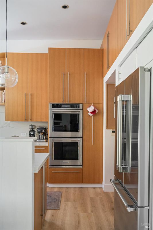 There are roughly 900 Eichlers in Terra Linda. This one is not like the others. In 2002, 704 Las Colindas was taken down to its bones and rebuilt from the ground up. Not renovated, but reconstructed entirely, with ceilings raised to 12 feet, systems replaced, and every finish chosen deliberately. Step inside and the atrium greets you with a skylight that opens, mature plants growing in built-in planters, and warm wood floors that run the length of the space. The enclosed atrium entry was originally a koi pond. From there, the house opens into one generous, light-filled room where the living area anchors around a dual-mode fireplace and a wall of glass looking out to the backyard and the surrounding open space. The kitchen features a 48" Miele range with six burners and griddle (new 2026), dual wall ovens (new 2024), custom 72" cabinetry, and quartz counters wrapped in windows with garden views in every direction. All three bathrooms are spa-appointed with heated floors and Toto fixtures, and the Jack-and-Jill suite has a Jacuzzi tub. Lutron HomeWorks lighting, whole-home surround sound, dual-zone HVAC, Baldwin hardware, solid wood doors, copper pipes and trim, and custom built-ins throughout. The craftsmanship here is the kind that reveals itself slowly, long after you've moved in. Outside, a mature palm tree anchors a private patio with hill views, a bocce court, hot tub pad, mature fruit trees, and a statement palm, all at the base of the Terra Linda-Sleepy Hollow Divide. Oversized EV-ready 2-car garage with finished interior, office nook, and 3-car driveway. New roof 2021, exterior paint 2025, sewer lateral replaced and certified 2018. The neighborhood matches the house in ways that are hard to manufacture. Terra Linda is where residents voted in 1975 to permanently preserve the surrounding hillsides rather than develop them, where Lou's Takeaway sells out before noon, where Scotty's Market has been on the same corner since 1957, and where the community pool, the trails, several nursery schools, award-winning Vallecito Elementary, and Highway 101 are all within a few minutes of each other. It is the kind of place people discover and decide never to leave. 4 beds, 2.5 baths, 1,830 sq. ft. Central heat/AC, instant hot water pump, ample storage, two-car garage, and additional two-car driveway parking.