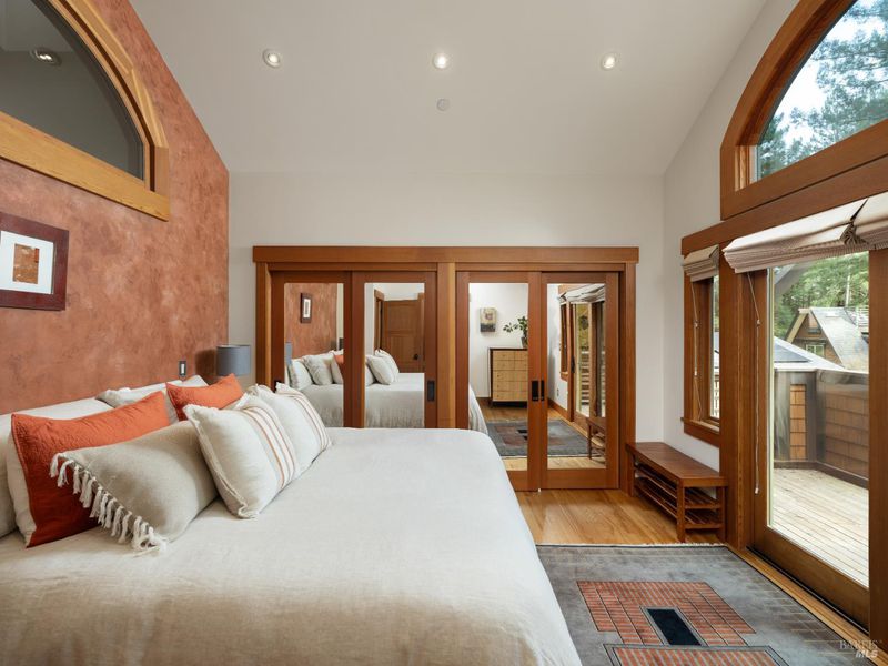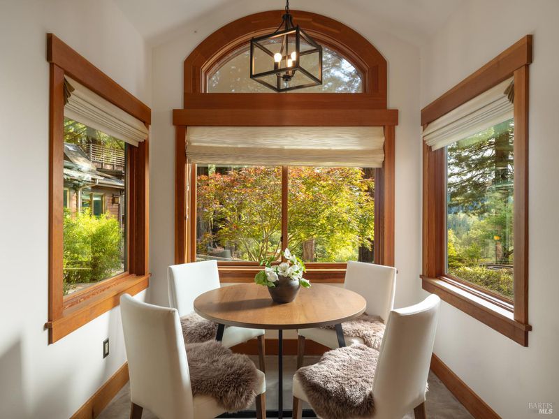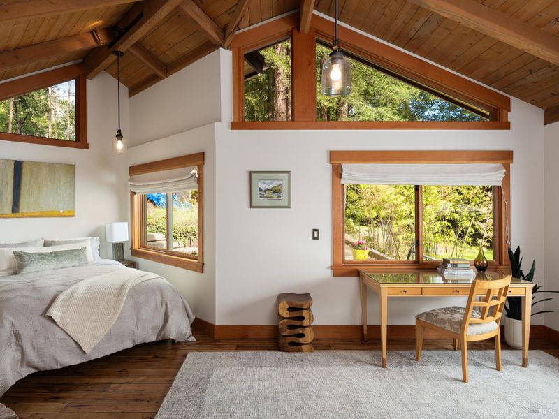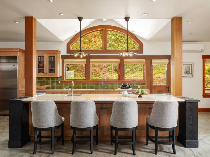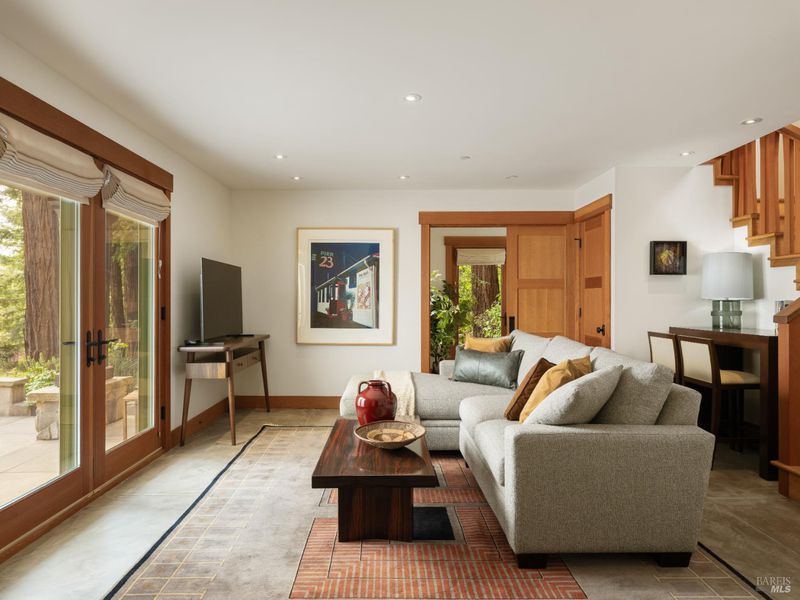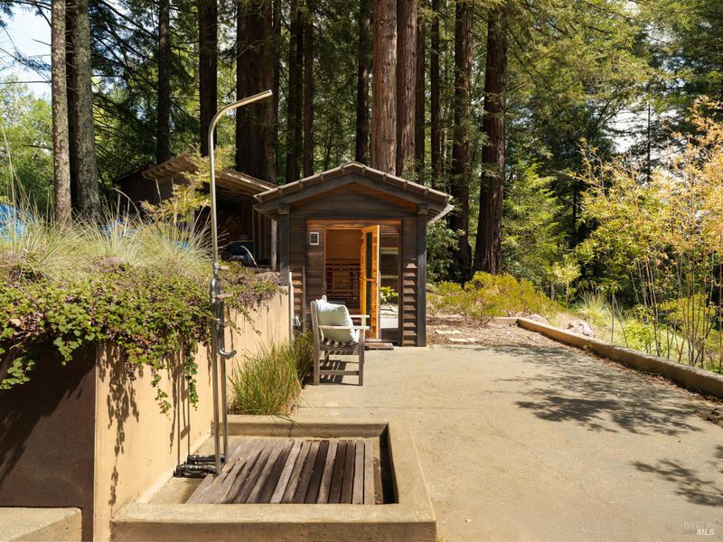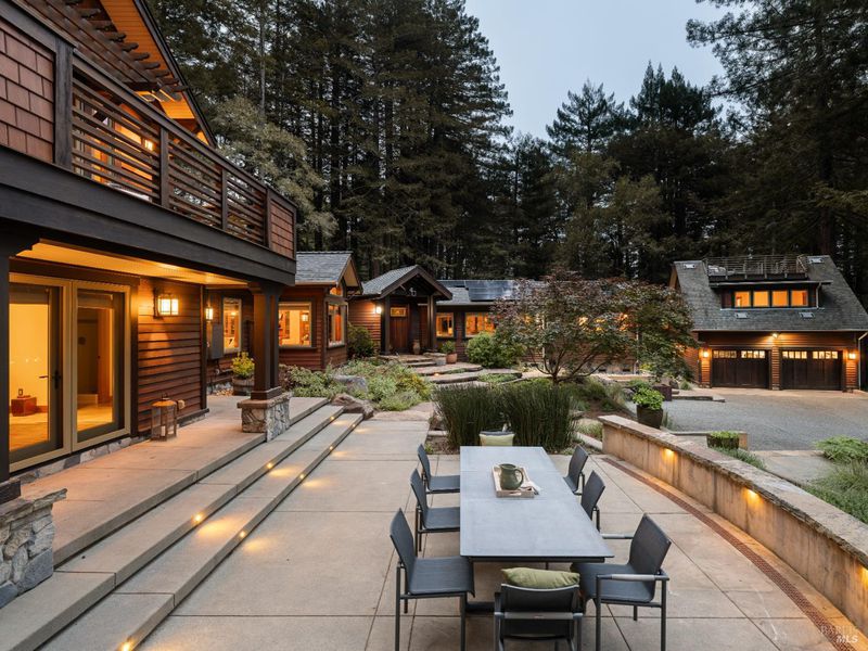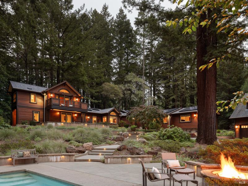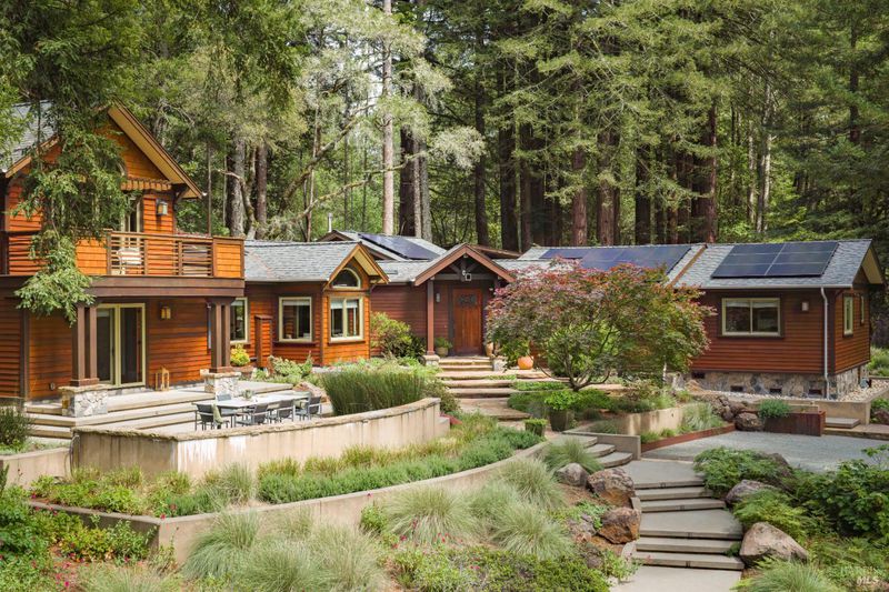 Set within approximately six acres in Occidental's sunbelt, 'Redwood Refuge' is surrounded by redwoods, yet open to light, views and sky. The property combines privacy and serenity in an idyllic setting encased in natural beauty, with vineyard views stretching across the valley. The home functions equally well as a quiet retreat and for large gatherings of family and friends. A complete renovation and expansion designed by Richard K. Pate and built by Hopkin Construction accentuates the home's thoughtful positioning in a grove of majestic redwoods. Each room is oriented to capture dual exposures, bringing in views of redwoods, landscaping, and distant vineyards throughout the day. Natural materials carry through the interiors, with varied wood finishes, custom cabinetry, and concrete flooring with radiant heat.The main living areas include a spacious living room with a high ceiling and a wood-burning stove, and the separate family room has double doors leading to the expansive patio area and pool. The spacious kitchen is designed for gathering, anchored by a twelve-foot island with generous seating and workspace. The kitchen features high end appliances and generous storage, and opens to a large dining area with built in cabinetry. An adjoining breakfast nook with windows on three sides offers stunning views, accentuating the home's connection with nature. All three bedrooms are en-suite and positioned with separation for privacy. The upper bedroom has a balcony overlooking the property and valley beyond. Multiple doorways provide access to a patio, pool, firepit and landscaped grounds designed with intention and scale. The outdoor areas are layered and fully developed, with extensive hardscape, lighting, new solar array, irrigation, and drainage systems designed by JKT Associates. Additional features include an outdoor sauna and shower. An adjacent structure includes an oversized two car garage and workshop; a large room, with balcony and a full bathroom with steam shower, suitable for a gym, home office or art studio; and an observation deck offering commanding daytime views and nighttime stargazing. A storage shed and separate woodshed and storage room provide practical support for the property. While the property is serene and secluded, it is only minutes to the town of Occidental.