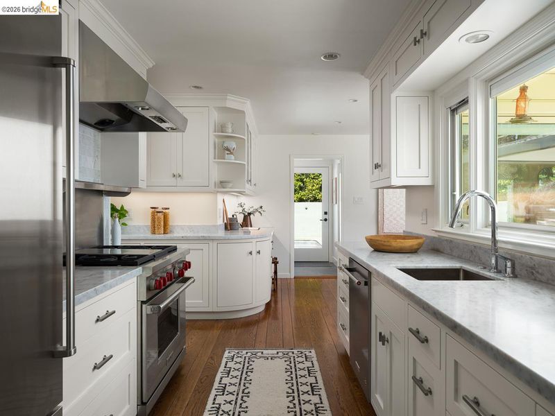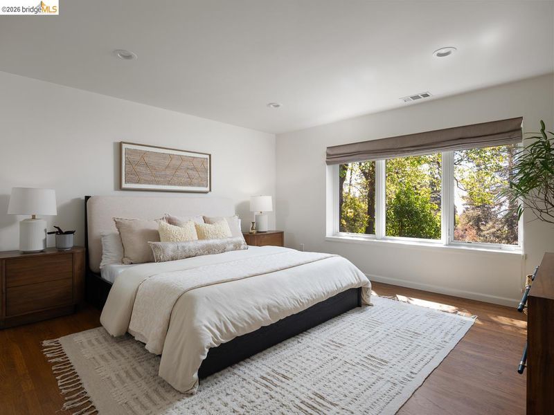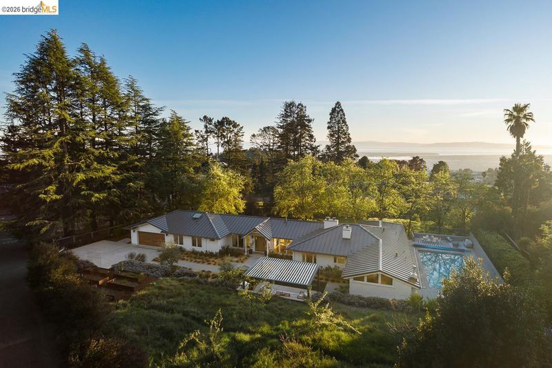 Set on approximately 1.1 acres in the coveted Hillcrest Estates enclave of the Oakland Hills, Skyland offers a rare blend of space, privacy, and natural beauty. Originally built in 1948 and thoughtfully reimagined in 2021, this single-level home balances timeless architecture with modern living. Walls of glass fill the home with natural light while framing views of redwoods, curated grounds, and the Bay. The well-designed layout includes 4 bedrooms, 4.5 baths, highlighted by a luxurious primary suite with a spa-like bath, steam shower, and soaking tub, along with a private guest suite. A dedicated executive office and separate studio/gym support work, creativity, and wellness. Designed for both everyday living and entertaining featuring a heated pool with Bay views, a pergola lounge with integrated lighting and sound, expansive patios, and a rare level lawn surrounded by mature landscaping originally envisioned by Napa Valley designer Jack Chandler. The kitchen offers marble countertops, Wolf and Sub-Zero appliances, abundant storage, and a walk-through pantry. Solar, a whole-home generator, enterprise-grade networking, and advanced air filtration complete the home; single-level living on over an acre with Bay views, an incredibly rare combination seldom found in the Bay Area.