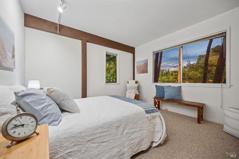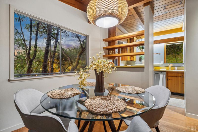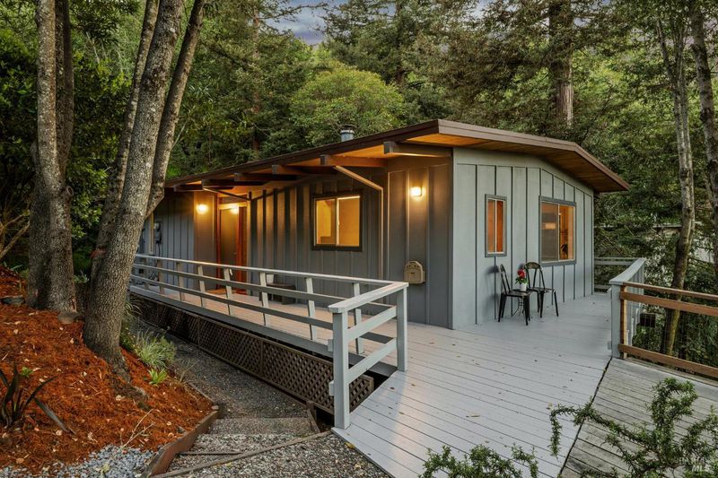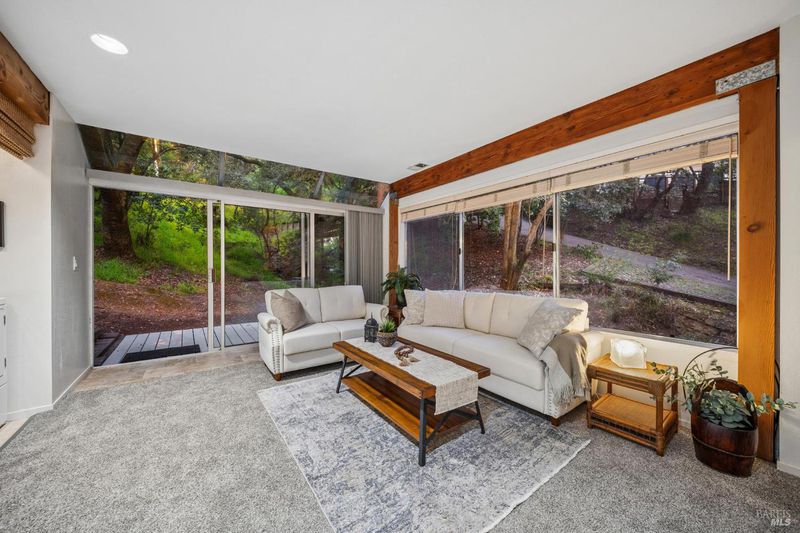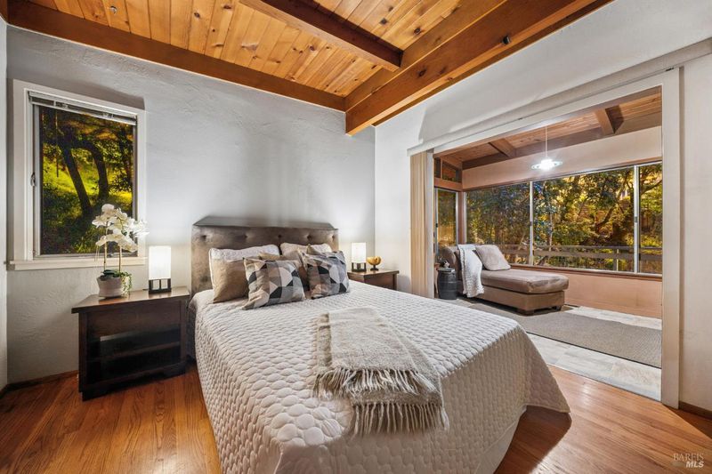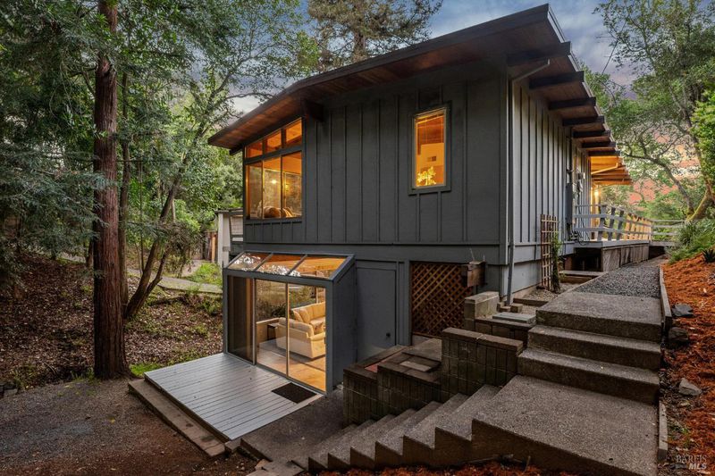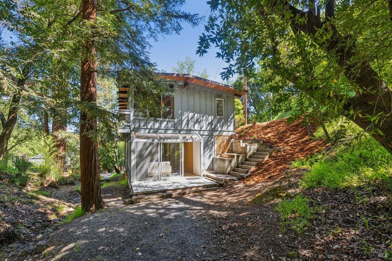 A home in the hills of south San Rafael provides an outstanding balance of what makes Marin County so special: A peaceful wooded setting in an area with great year round weather and convenient access to schools, shopping and services and to regional transportation. The Picnic Valley neighborhood allows one to take advantage of all of this: a morning or evening walk among quaint hillside homes or open spaces with towering trees. This house, isolated from busy streets but very accessible, benefits from surrounding undeveloped hillsides but nearby, friendly neighbors. The mid-century house has been remodeled to take advantage of the site including a seasonal stream with multiple small waterfalls. The house is all about taking advantage of the views of the wooded setting outside coupled with exposed wood beams and ceilings on the upper floor and knotty pine cabinets in the kitchen. The open living and dining area is focused on the fireplace and framed by windows that give one the feeling of living in a tree house. Sliding glass doors look out toward a large old growth redwood. The galley kitchen is full of charm, with the wood cabinetry, stainless appliances, and windows on two sides that keep things bright. Just beyond it, the dining area flows naturally into the living space. On this level a primary bedroom and adjacent sitting room wrapped in glass offers a calm, light-filled space that feels entirely removed from the rest of the world. A bathroom and space next to the stairs (e.g. office, reading/library, etc) and walk-in entry closet round out this level. Head downstairs and you'll find a second full living/ family area with a wall of glass looking out to a natural area, and a washer/dryer surrounded by cabinetry. Two additional bedrooms, a full bath, walk-in storage, and a separate deck make the lower level incredibly versatile. Whether you need a home office, a guest suite, a creative studio, or all three, the layout gives you flexibility. Outside, the property is lush and private, with mature trees, natural landscaping but opportunities for planting and gardening and deck areas that make spending time outdoors genuinely appealing year-round. The setting feels worlds away while you're only minutes from downtown San Rafael, Highway 101, restaurants, parks, shopping and some of the best hiking and outdoor recreation in the Bay Area. All of it wrapped in wood, light, and trees.