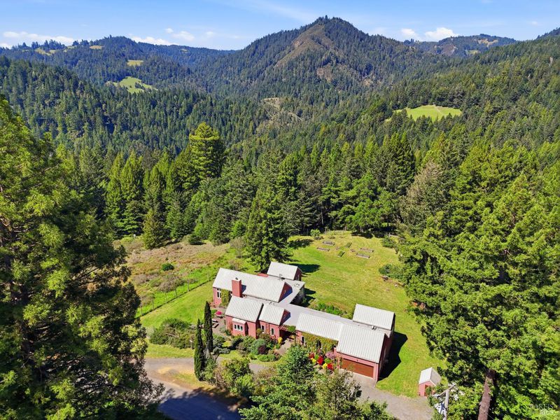 Deep Springs Ranch embodies the finest aspects of coastal living: set upon over 11 tranquil acres, with ocean, meadow and redwood forest views, is this gorgeous single-story home designed by architect Thomas Ballard. Impressive wooden double doors open to a garden oasis and a covered breezeway connecting the generous and private 2-bedroom guest suite with the main house and its spacious kitchen, dining room, living room and well laid out primary bedroom suite. The home has been meticulously maintained and is graced with beautiful details such as dramatic vaulted ceilings and flooring of exquisite Brazilian cherry wood and Italian terra cotta tiles. Large windows and glass doors throughout frame incredible views of nature, and starry skies at night. The living room, kitchen, primary bedroom, and outdoor deck all face west for spectacular sunsets over the ocean. At a more than 700-foot elevation, the home enjoys a wonderful temperate climate, often above any fog that might linger along the ocean. This remarkable property is part of the Muniz Ranches, a collection of multiacre parcels created in the 1970s. Muniz Ranches adjoins, and has private access to, the 5,600-acre Jenner Headlands Preserve with its miles and miles of hiking trails. One of many local beaches, Russian Gulch Beach, is conveniently located near the gated entrance at Highway 1. This rare and extraordinary getaway or permanent home is less than 18-miles to downtown Guerneville, less than 35-miles to Santa Rosa, and only 80-miles north of the Golden Gate.
