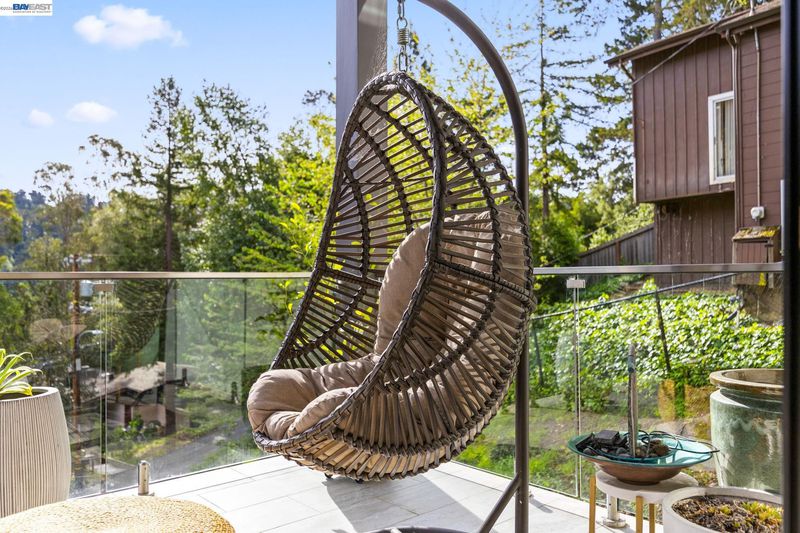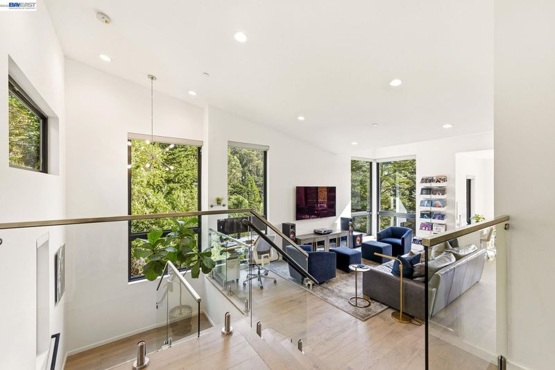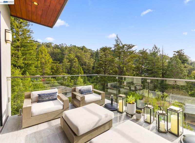 Designed by Oakland-based, boutique residential design architect John Newton, 45 Homeglen is a striking modern residence tucked on a quiet lane in Montclair—minutes from the shops, restaurants, & vibrant Sunday mornings of Montclair Village. This 2020-construction home has been thoughtfully designed and meticulously maintained. An open floor plan welcomes you with oversized windows framing lush views from nearly every room. It feels like living among the treetops—even from the chef's kitchen, with marble countertops, a waterfall island, sleek appliances, & designer fixtures. Dining and living areas are crowned by a signature butterfly roof for dramatic ceiling height and wonderful scale. An oversized sliding door opens to a glass-walled deck with peaceful verdant views. The lower level offers a serene primary suite w sunny bath and direct deck access, two additional bedrooms, and another full bath. Upgrades include A/C, whole-home reverse osmosis, motorized shades, and a customized storage. The rear yard has exciting potential—a garden, or a perhaps a detached structure (ADU plans avail). Ample storage and a 2-car garage w/ internal access. Close to Huckleberry and Sibley Regional Parks, coveted Montclair schools, and the wooded setting that makes Homeglen Lane so special.