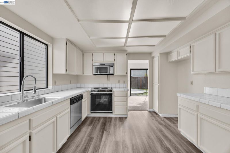 Dishwasher, Electric Range, Microwave, Gas Water Heater, 220 Volt Outlet, Tile Counters, Eat-in Kitchen, Electric Range/Cooktop