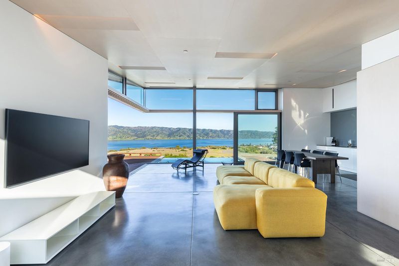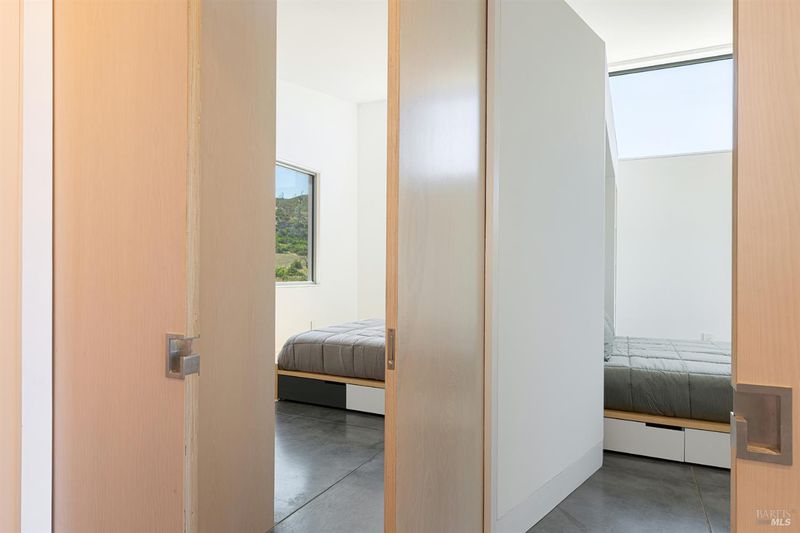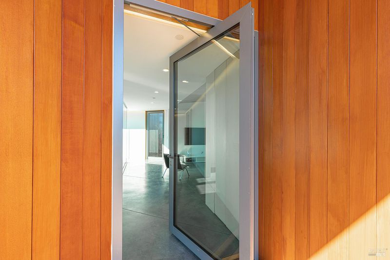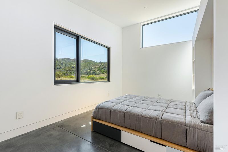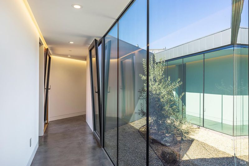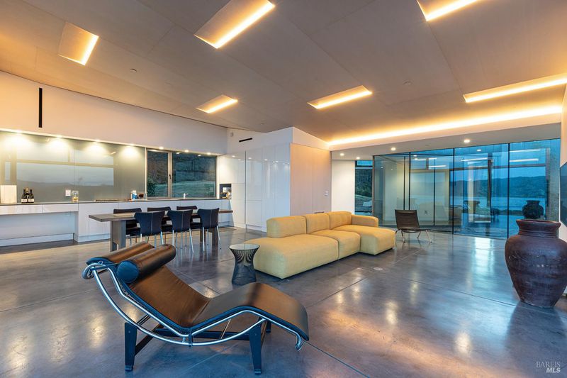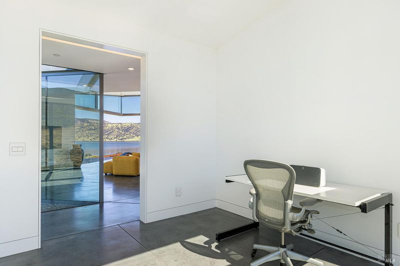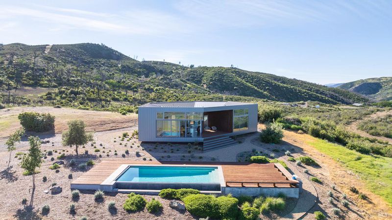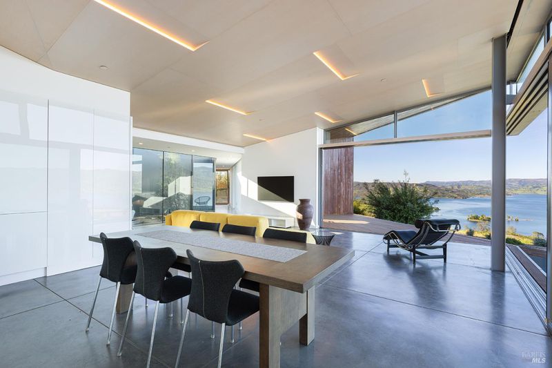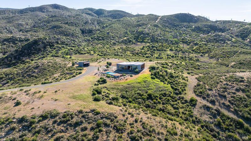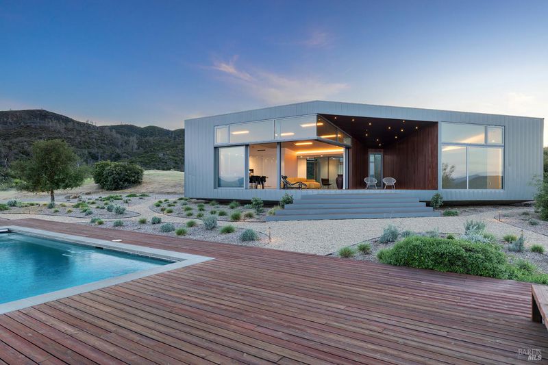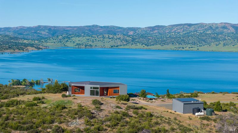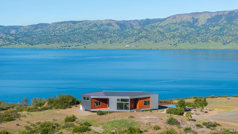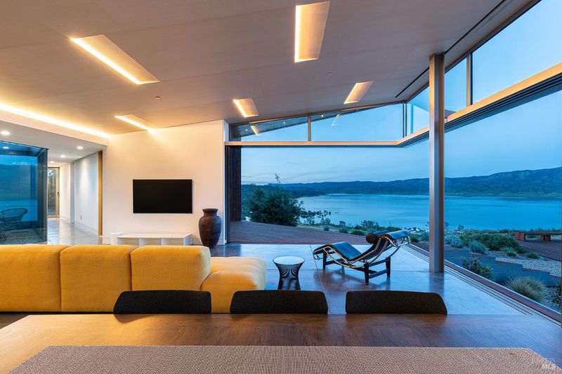 The Berryessa Lake House is a breathtaking fusion of architectural innovation and engineering precision. Situated on 95 acres in Napa County, this award-winning, IwamotoScott-designed residence is a steel & glass marvel offering panoramic views of Lake Berryessa & the surrounding valley landscape. The home's bold hexagonal design and cantilevered concrete foundation appear to hover above the natural terrain. Massive European glass doors slide seamlessly into wall pockets, opening the living area to the outdoors. While the exterior boasts a dramatic silhouette, the interior is thoughtfully designed with rectangular living areas, prioritizing comfort and functionality. The home includes three bedrooms, an office, two full baths, and a dramatic great room surrounding a central glass courtyard, a serene focal point that brings natural light deep into the home. The detached garage, with aircraft hangar doors, serves as the command center for the property's infrastructure. Designed to be fully self-sufficient with its own solar energy system, spring-fed water supply and commercial generator. The vast acreage offers several potential building sites for expansion. This one-of-a-kind property is ideal for a discerning buyer seeking privacy, sustainability, and impeccable modern design.