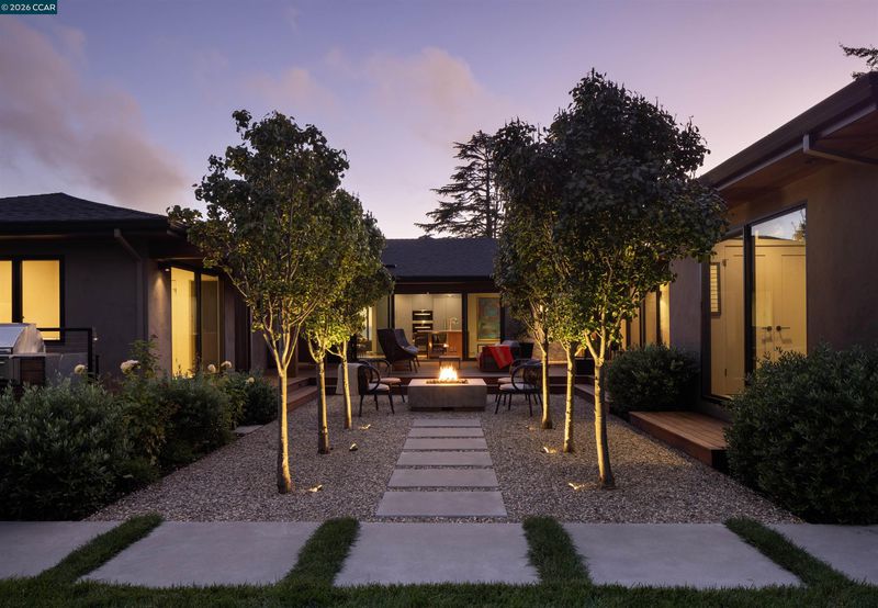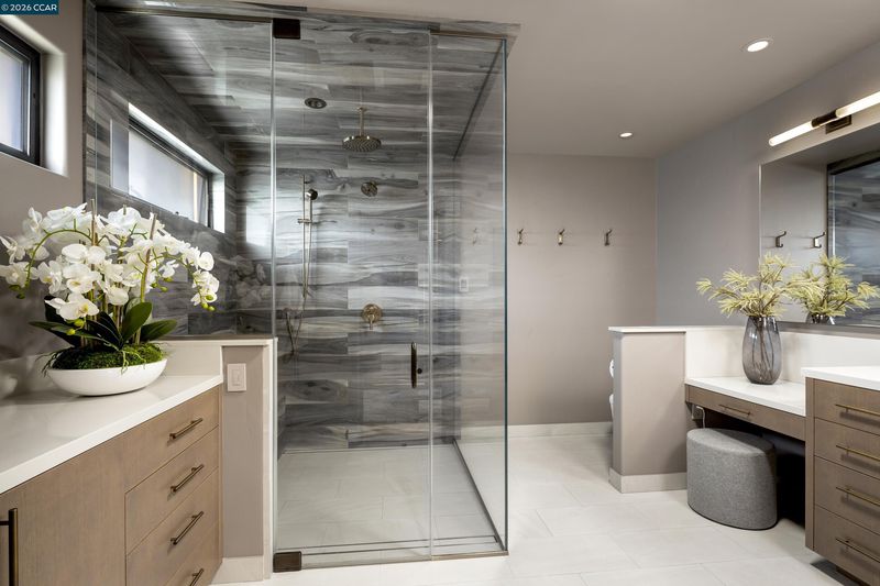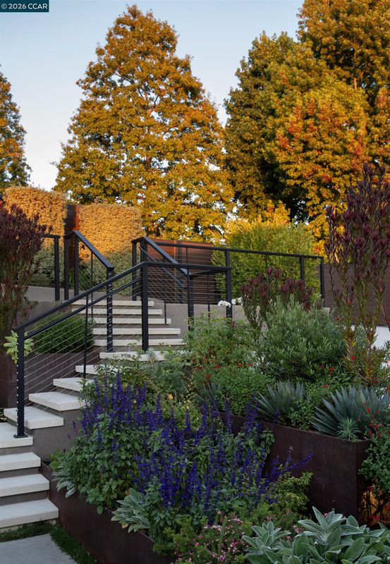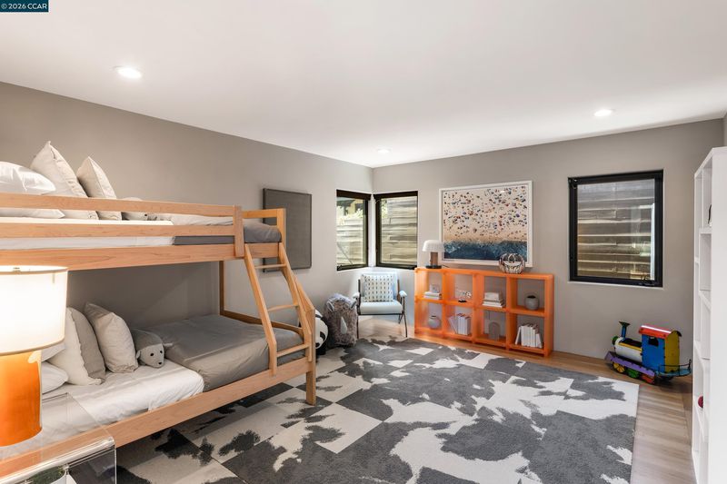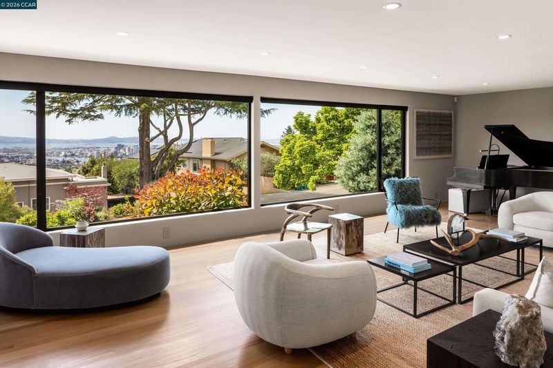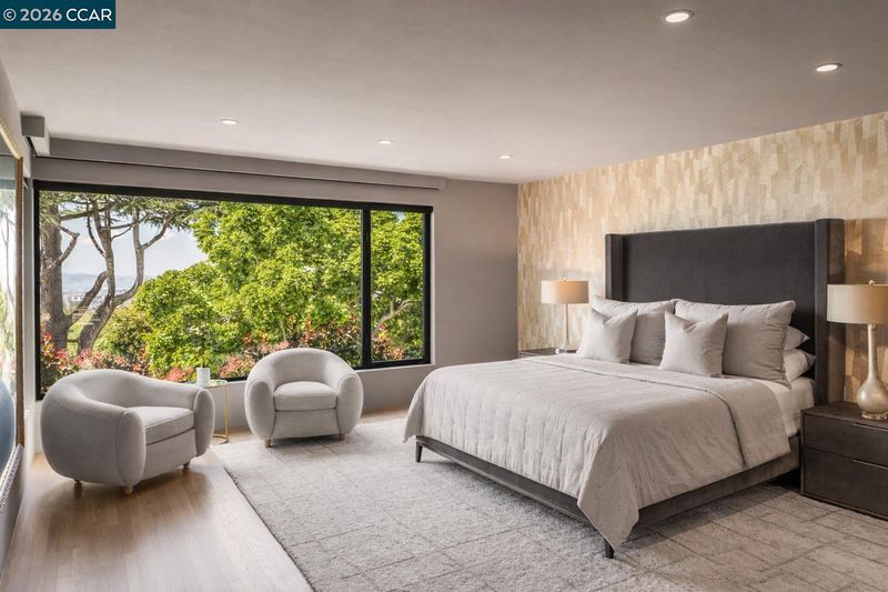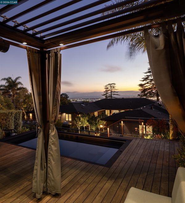 A private oasis designed for indoor-outdoor living, inspired by the elegance of luxury hospitality. Thoughtfully reimagined, this residence blends refined contemporary design with exceptional comfort and functionality. The home offers 5 bedrooms and 4 full and 2 half bathrooms, including 3 en-suite retreats. The primary suite is a sanctuary, featuring a spa-like bathroom with an expansive multi-head and steam shower. At the heart of the home, the chef’s kitchen is appointed with Wolf, Sub-Zero, and Miele appliances, dual wine refrigerators, and custom cabinetry, flowing effortlessly into the main living spaces and to the expansive deck. Outdoor living is a defining feature, with Thermory decking, a fire pit lounge, multiple entertaining areas, a basketball court, a climbing wall, and a private plunge pool/spa with cabana-style seating overlooking the Bay. An expansive window wall fills the living room with natural light and frames views of the landscaped grounds, downtown Oakland, and San Francisco beyond. Additional highlights include a formal dining room, dedicated workspaces, and a finished lower level with a large entertaining room, gym, bathroom, wine room, and generous storage. A rare offering where architecture, privacy, and resort-like living come together beautifully.
