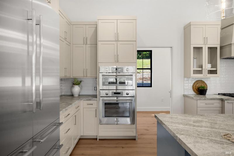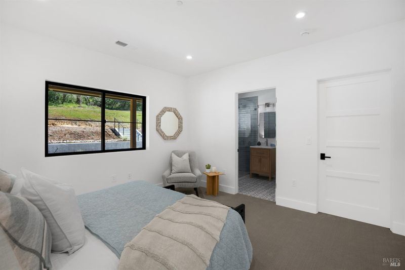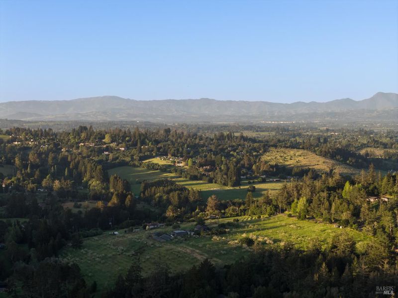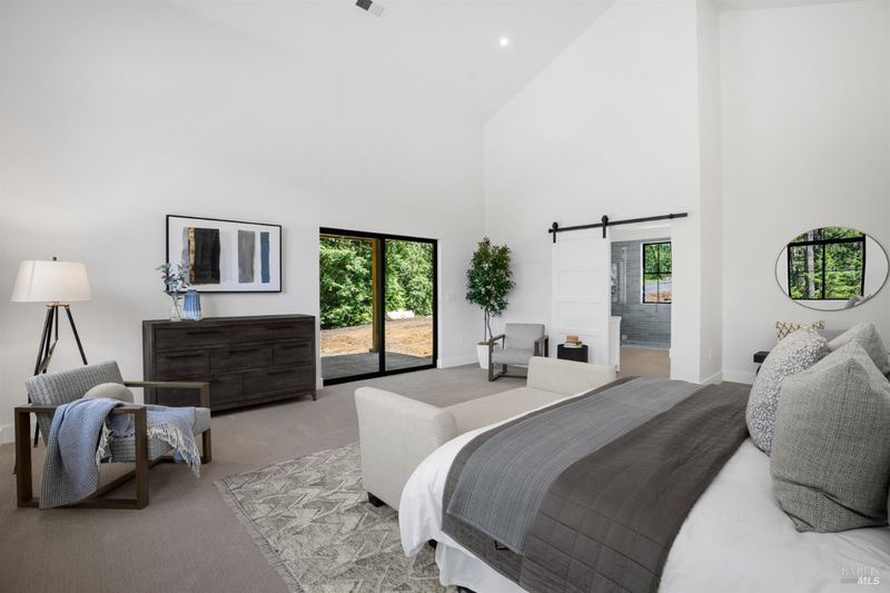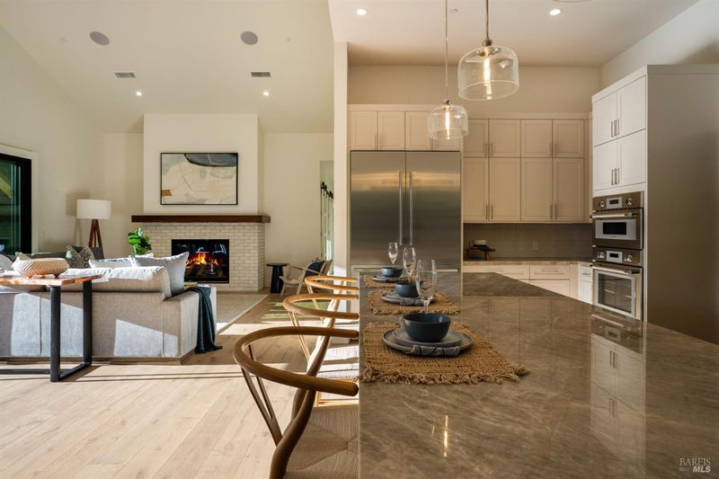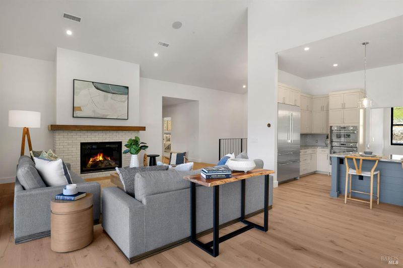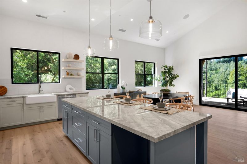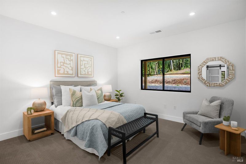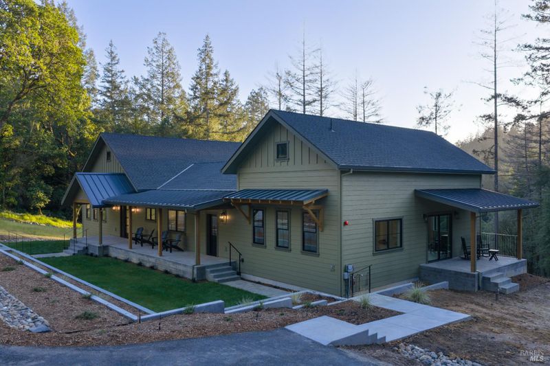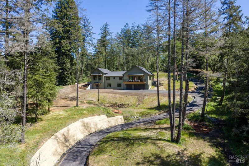 Contemporary craftsman estate on 2 private view acres in Sebastopol's scenic countryside offering single-level living with luxury finishes, abundant natural light, and seamless indoor-outdoor flow. 3BD + office, 3.5BA home features an open-concept great room with engineered wood floors, gas fireplace with stone surround, and large sliding doors opening to an expansive view deck. Chef's kitchen includes quartzite slab countertops, farmhouse sink, undercabinet lighting, premium Thermador appliances, and a walk-in pantry with sink, cabinetry, and windows. Primary suite retreat with vaulted ceilings (14-21 ft), private patio access, and serene views. Spa-inspired bath with freestanding soaking tub, curbless walk-in shower, dual vanities, walk-in closet, and separate water closet. Two additional ensuite bedrooms with walk-in closets plus a dedicated office with beautiful natural light. Additional features include elegant powder room, laundry room with exterior access, sink and quartzite counters, engineered wood flooring, and thoughtful modern design throughout. Unconditioned lower level with plumbing and electrical in place offers potential for a 2 bedroom additional dwelling unit, guest suite, or studio. 5 bedroom septic installed and ready for ADU. Terraced landscaping with irrigation and lighting, open meadow, shared well with 5,000-gallon holding tank, solar panels, and 6-car garage. Private, peaceful setting just minutes from downtown Sebastopol and the Sonoma Coast.