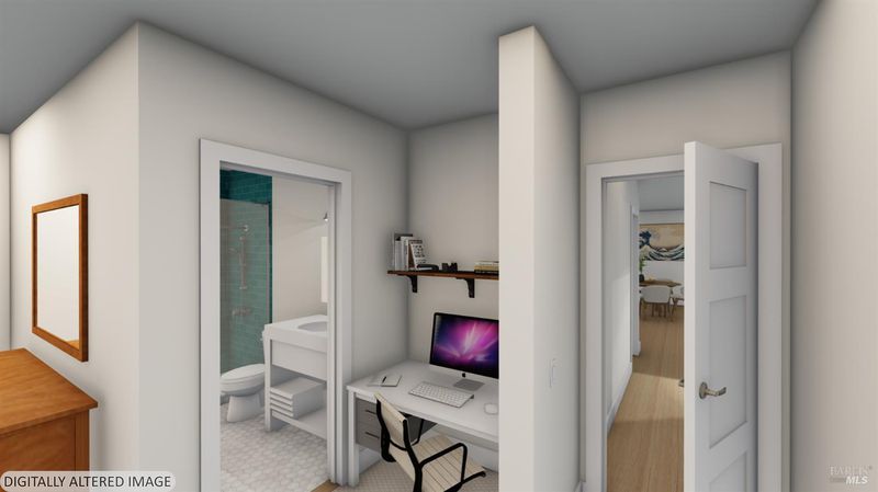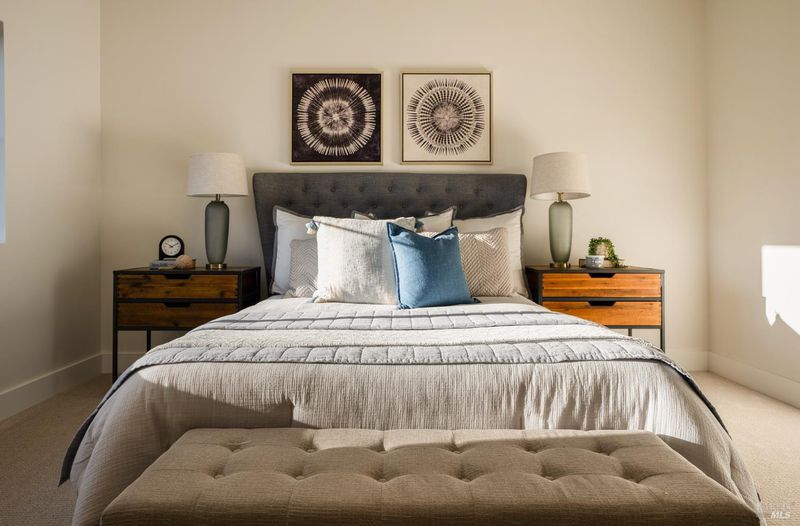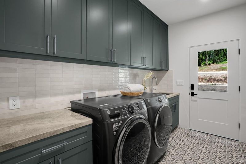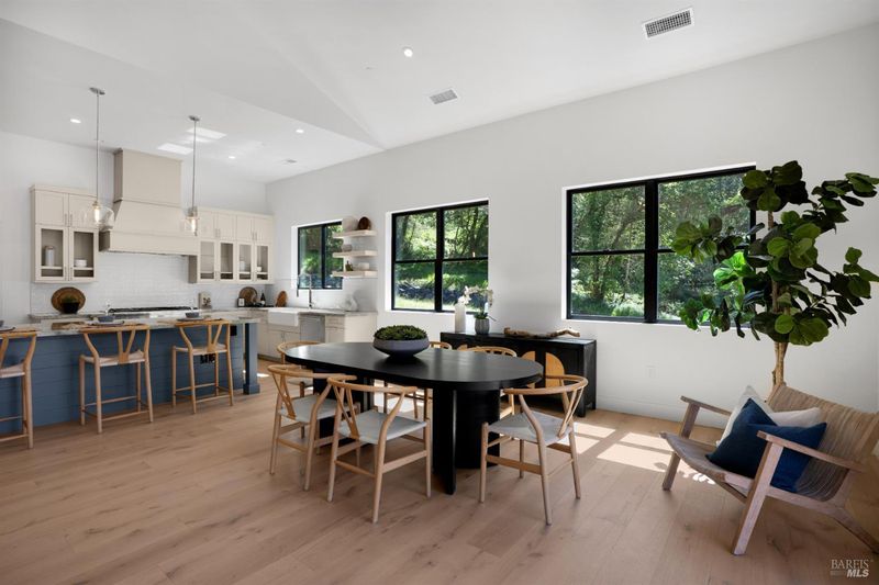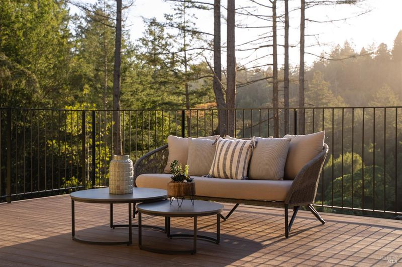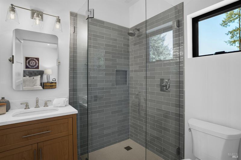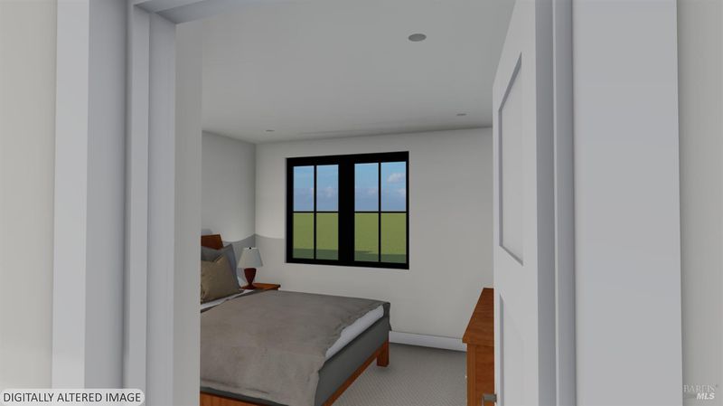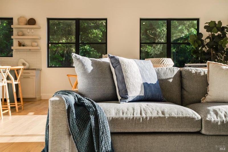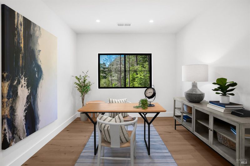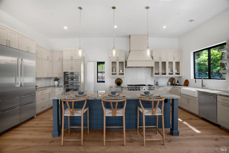 Contemporary craftsman estate on 2 private view acres in Sebastopol's scenic countryside offering single-level living with luxury finishes, abundant natural light, and seamless indoor-outdoor flow. 3BD + office, 3.5BA home features an open-concept great room with engineered wood floors, gas fireplace with stone surround, and large sliding doors opening to an expansive view deck. Chef's kitchen includes quartzite slab countertops, farmhouse sink, undercabinet lighting, premium Thermador appliances, and a walk-in pantry with sink, cabinetry, and windows. Primary suite retreat with vaulted ceilings (14-21 ft), private patio access, and serene views. Spa-inspired bath with freestanding soaking tub, curbless walk-in shower, dual vanities, walk-in closet, and separate water closet. Two additional ensuite bedrooms with walk-in closets plus a dedicated office with beautiful natural light. Additional features include elegant powder room, laundry room with exterior access, sink and quartzite counters, engineered wood flooring, and thoughtful modern design throughout. Unconditioned lower level with plumbing and electrical in place offers potential for a 2 bedroom additional dwelling unit, guest suite, or studio. 5 bedroom septic installed and ready for ADU. Terraced landscaping with irrigation and lighting, open meadow, shared well with 5,000-gallon holding tank, solar panels, and 6-car garage. Private, peaceful setting just minutes from downtown Sebastopol and the Sonoma Coast.