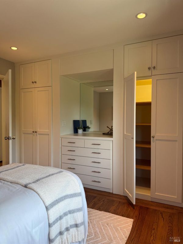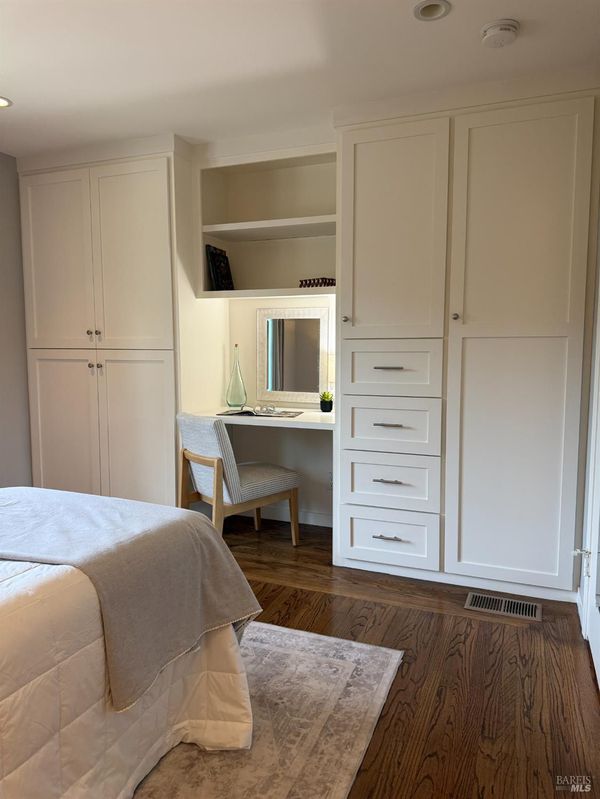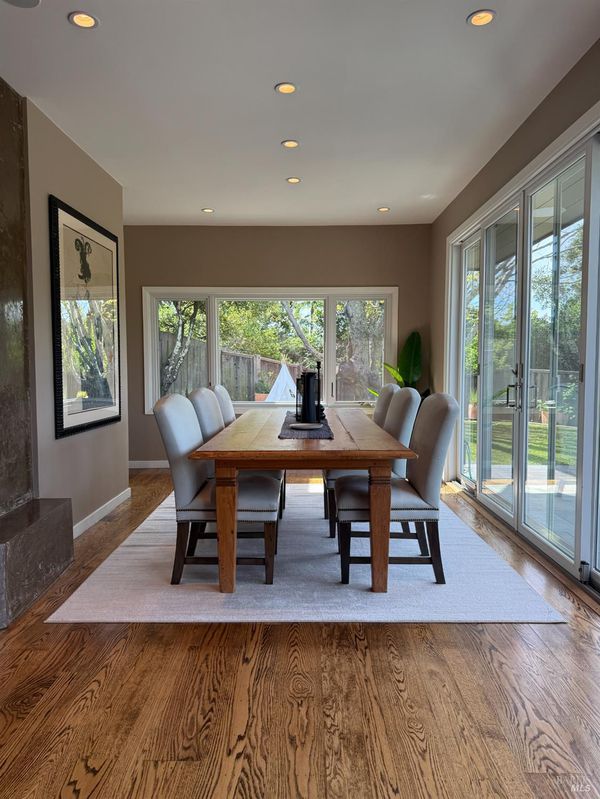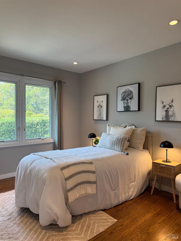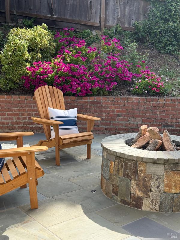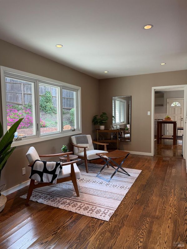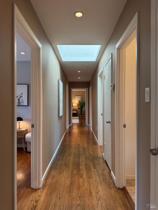 This coveted Palm Hill home offers a 12,000 sq. ft lot with a large level landscaped yard and a Mid-century home. The formal entry steps down to the great room with living, dining and lounge areas. This is quintessential California living with easy indoor-outdoor flow. The bedroom wing is separate from the living areas with a large primary bedroom & walk-in closet, and original attached bath. The 4 bedrooms all have built-in closets and the 5th bedroom is being used as an office with a built-in desk recessed into the closet. There is also a hall full bathroom and a lovely remodeled guest half bathroom. Recessed lighting and speakers in great room. The private front yard offers a spacious lawn, mature orange & olive trees. Lovely upgrades include all Anderson duel-pane low E SmartSun tempered with Argon windows and sliding doors. There is a large bluestone patio for entertaining and quiet mornings watching the sunlight hit Mt. Tam. The home is enhanced by hardwood floors, built-in closets, many floor to ceilings windows/doors, and outside there is a built-in gas firepit, raised stone garden beds in back, and low rock retaining walls in frontyard. Repairs and improvements made in 2013 include complete electrical upgrade; total drainage upgrade to include multiple drains, new driveway paved; new sound system video/music; and new gas fireplace. Railings were added inside and out and insulation was added under the floor and in the attic.