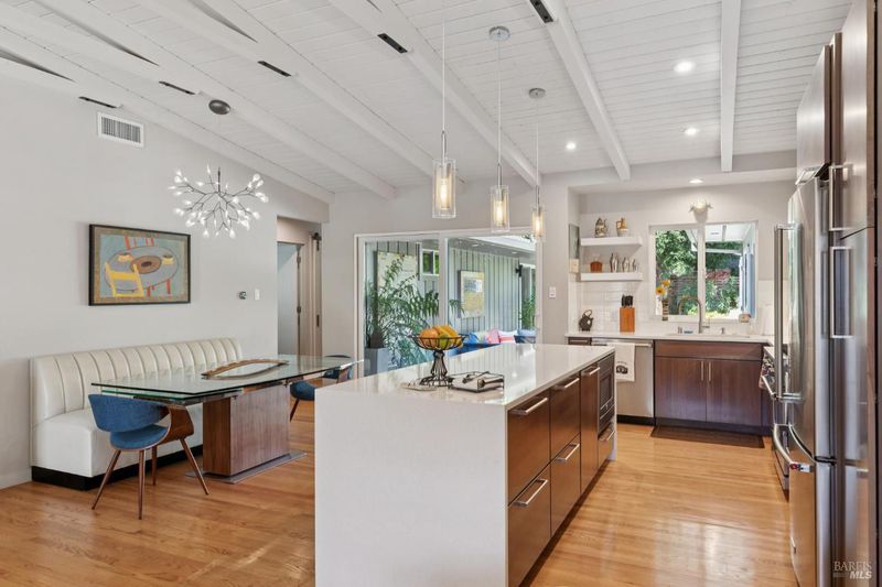 Beautiful and pristine contemporary single-level home on Sonoma's coveted Eastside. The main residence offers 3 bedrooms and 3 bathrooms, plus a detached pool house/casita with a full bath for added flexibility. Vaulted wood ceilings and hardwood flooring bring warmth and a clean, modern feel throughout. The chef's kitchen includes quartz countertops, a large island, Viking 6-burner range, and Viking dishwasher. Recent upgrades include a new roof, solar, and an EV charger. The backyard is designed for easy indoor-outdoor living, featuring a heated pool, hot tub, and expansive deck ideal for dining and entertaining. Mature landscaping creates a private, relaxed setting. The pool house/casita is fully equipped, making it well-suited for guests, a home office, or additional living space. Located just a short distance to Sonoma's historic Plaza, restaurants, and wineries, this property offers a convenient Eastside location paired with a comfortable Wine Country lifestyle.